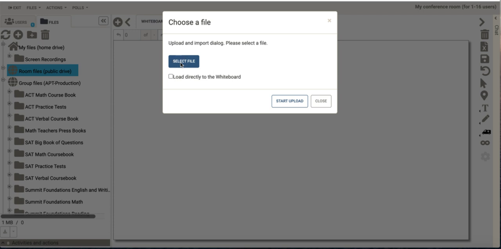 Users can upload and download documents from room files or save annotated whiteboards at any time. So if, for example, a student would benefit from reviewing materials and notes on iCollaborate between sessions, then all he or she has to do is visit his or her private tutoring room. Students can also upload photos, scans, or documents in advance of their next meeting with their tutor.